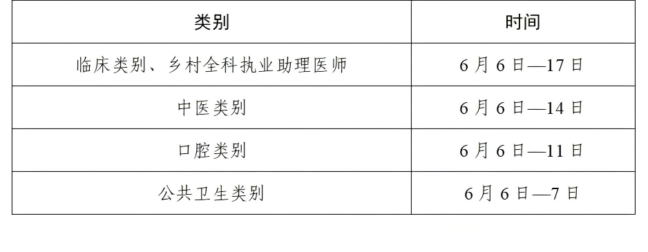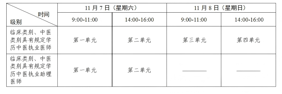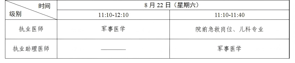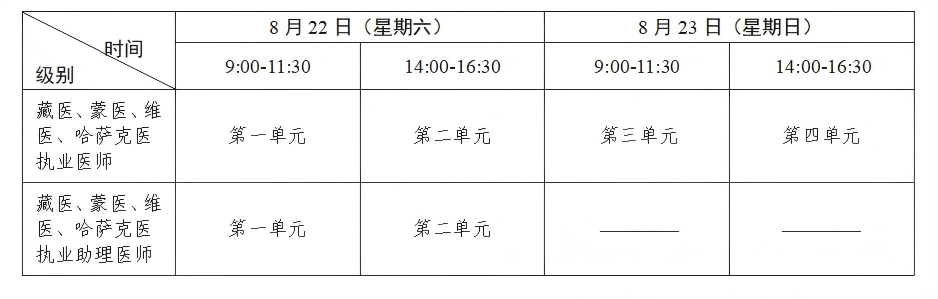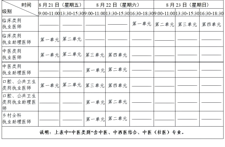 考试实行计算机化考试,军队现役人员、文职人员加试军事医学,院前急救岗位和儿科专业加试相应内容。中医类别藏医、蒙医、维医、哈萨克医专业实行纸笔考试。统一考试时间如下: